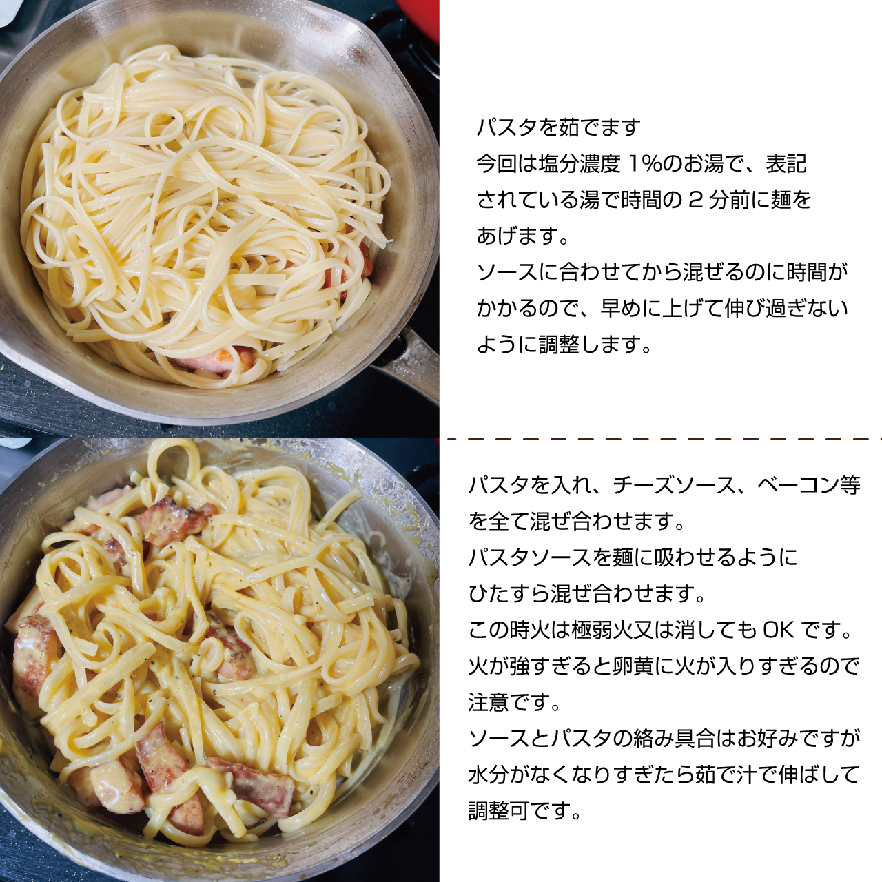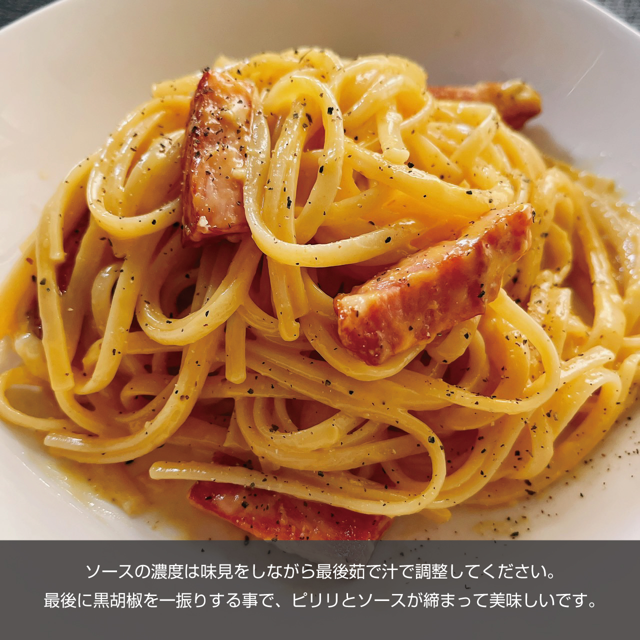 火が強すぎると卵黄に火が入りすぎぼそっとしたソースになるので注意です。ソースとパスタの絡み具合はお好みですが水分がなくなりすぎたら茹で汁で伸ばして調整可です。