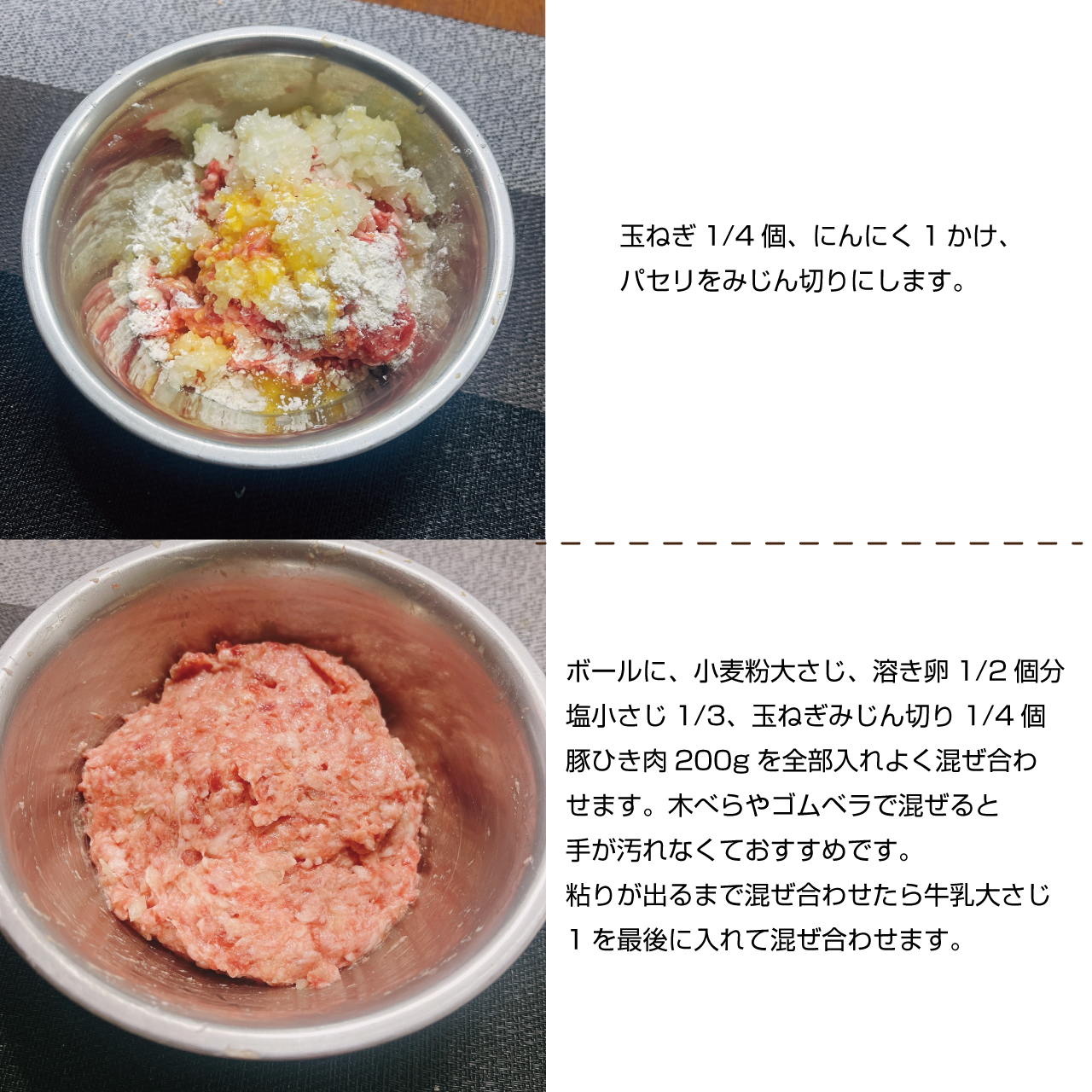 ②ボールに、小麦粉大さじ、溶き卵1/2個分 、塩小さじ1/3、玉ねぎみじん切り1/4個、豚ひき肉200gを全部入れよく混ぜ合わせます。