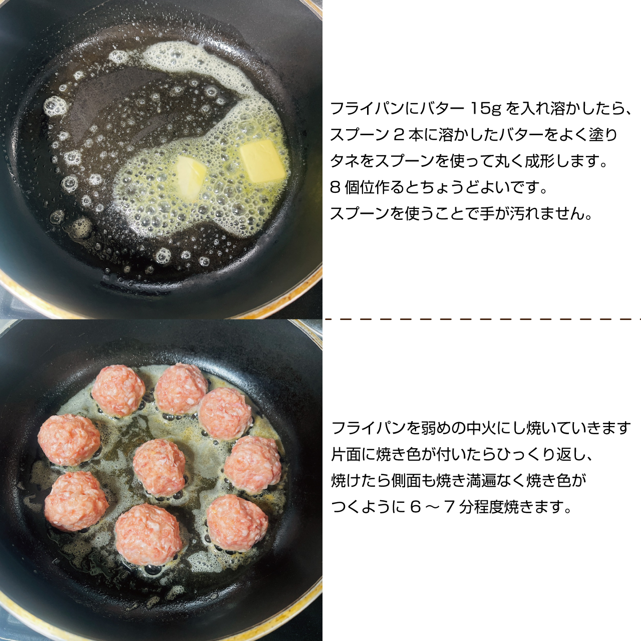 ③フライパンにバター15gを入れ溶かしたら、スプーン2本に溶かしたバターをよく塗り②のタネをスプーンを使って丸く成形します。8個位作るとちょうどよいです。スプーンを使うことで手が汚れません。