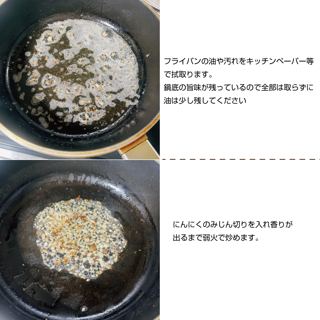 ⑥ソース作り フライパンの油や汚れをキッチンペーパー等で拭取ります。鍋底の旨味が残っているので全部は取らずに油は少し残してください。そこににんにくのみじん切りを入れ香りが出るまで弱火で炒めます。