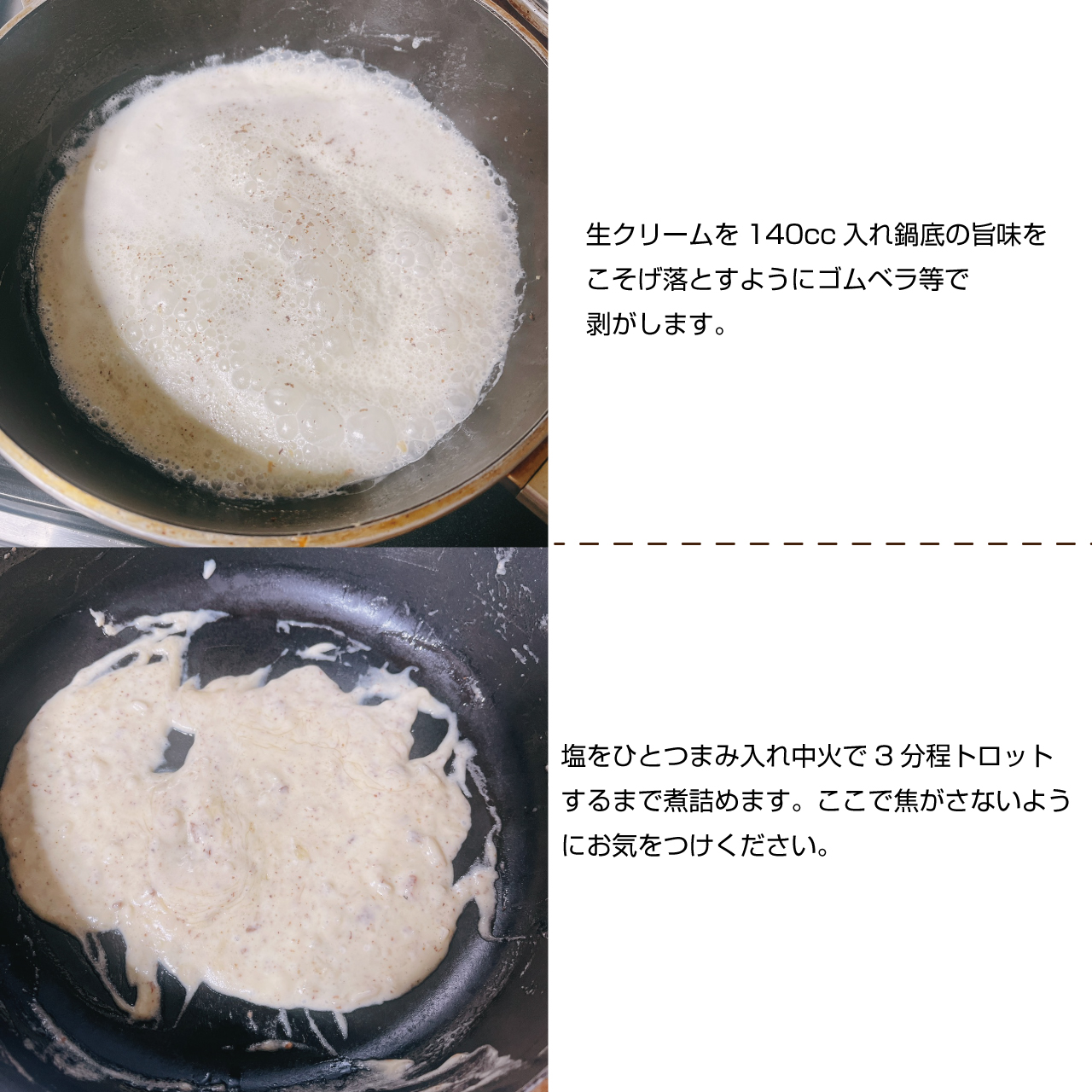 ⑦生クリームを140cc入れ鍋底の旨味をこそげ落とすようにゴムベラ等で剥がします。塩をひとつまみ入れ中火で3分程トロットするまで煮詰めます。ここで焦がさないようにお気をつけください。