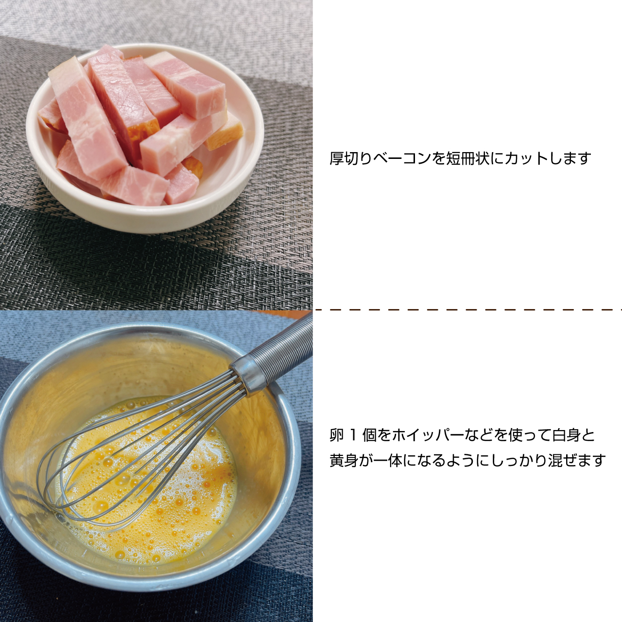 ①厚切りベーコンを短冊状にカットします。卵1個をホイッパーなどを使って白身と黄身が一体になるようにしっかり混ぜます。