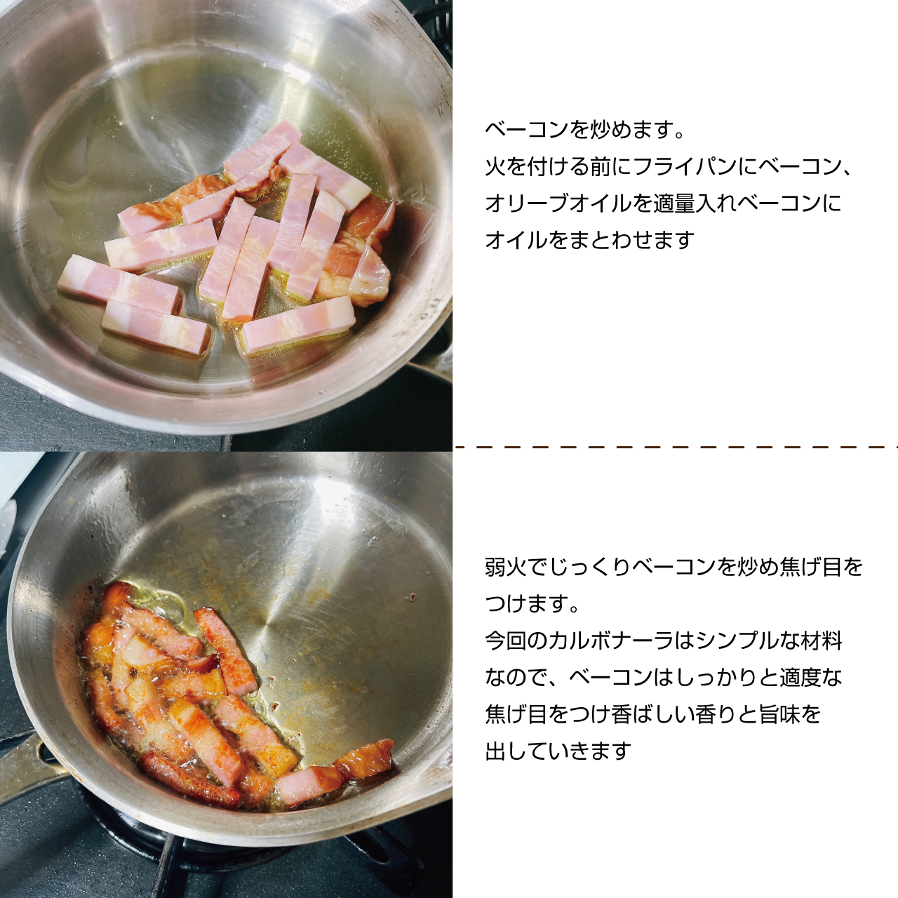 ③ベーコンを炒めます。火を付ける前にフライパンにベーコン、オリーブオイルを適量入れオイルをベーコンに纏わせます。弱火でじっくりベーコンを炒め焦げ目をつけます。