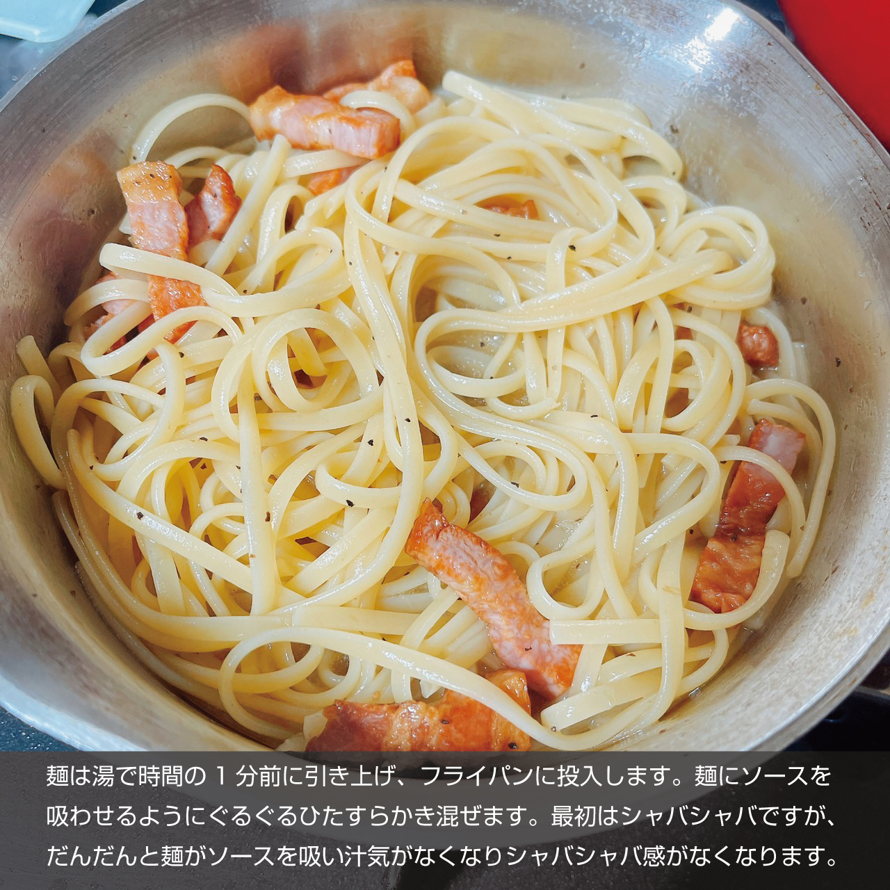⑤麺は湯で時間の1分前に引き上げ、④のフライパンに入れ麺にソースを吸わせるようにぐるぐるかき混ぜます。