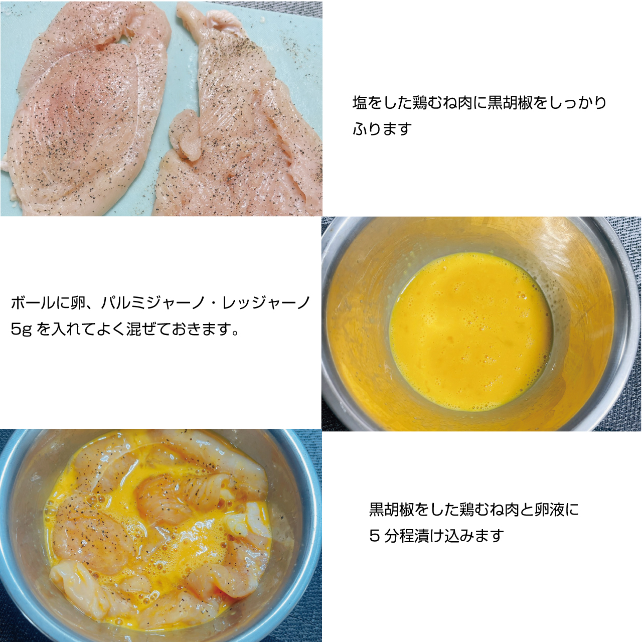 ⑤ 塩をした鶏むね肉に黒胡椒をし④の溶き卵に5分程漬け込みます