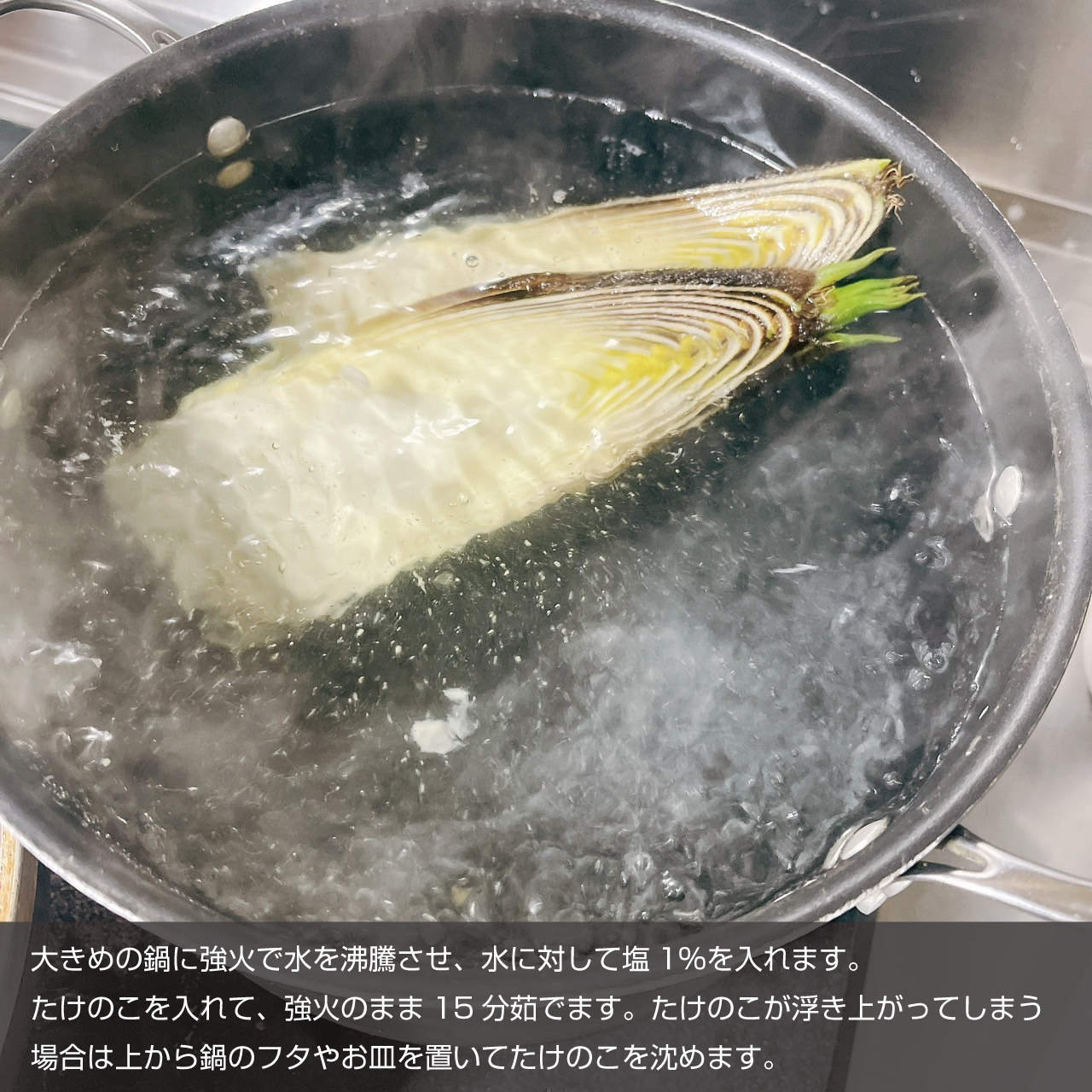 ⑤沸騰したお湯にたけのこを入れて、強火のまま15分茹でます。たけのこが浮き上がってしまう場合は上から鍋のフタやお皿を置いてたけのこを沈めます。