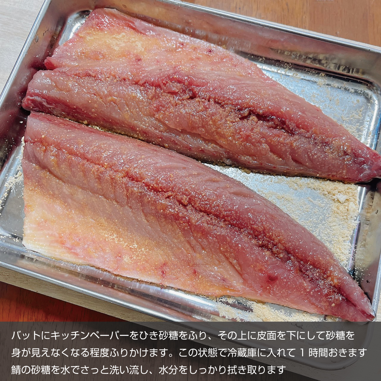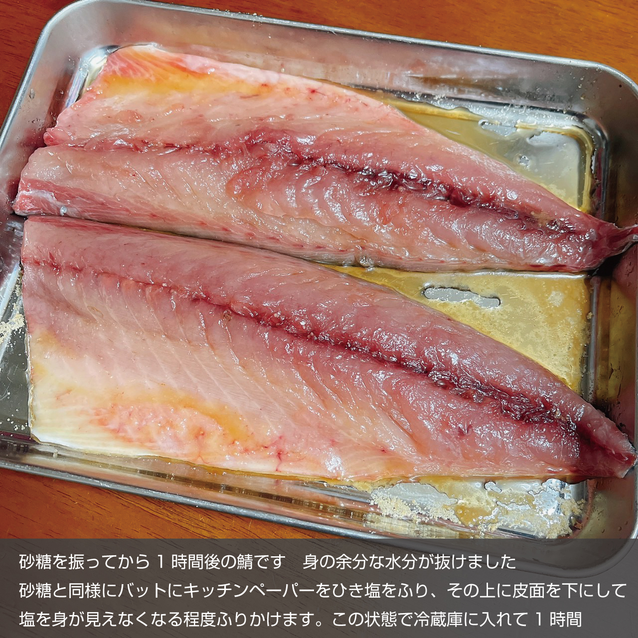 最初に砂糖でしめる事で身の水分がしっかり出て、次に塩を振った時に味の入りがよくなります。必ずこの順番で。