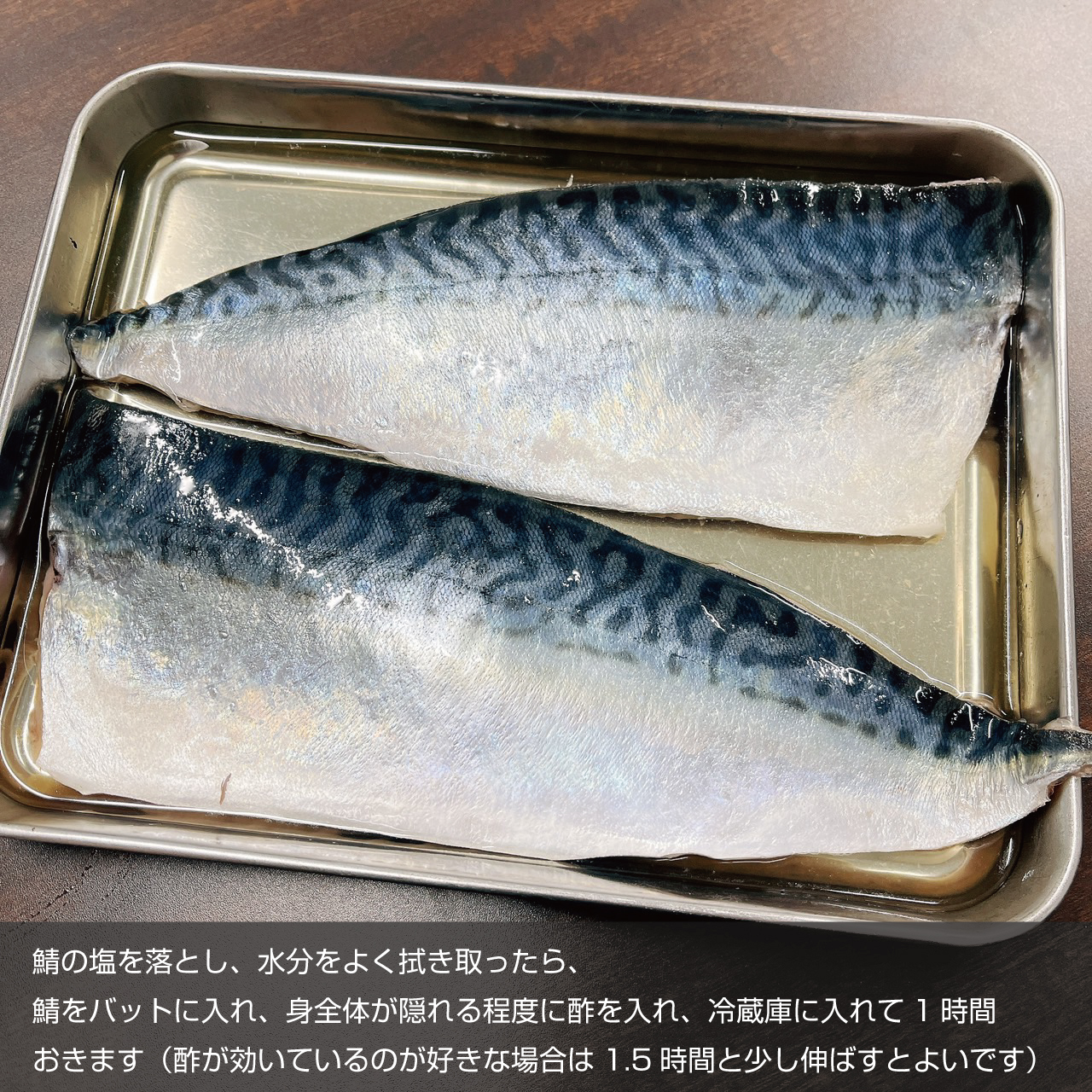 ⑥ ⑤の鯖をバットに入れ、身全体が隠れる程度に酢を入れ、冷蔵庫に入れて1時間おきます