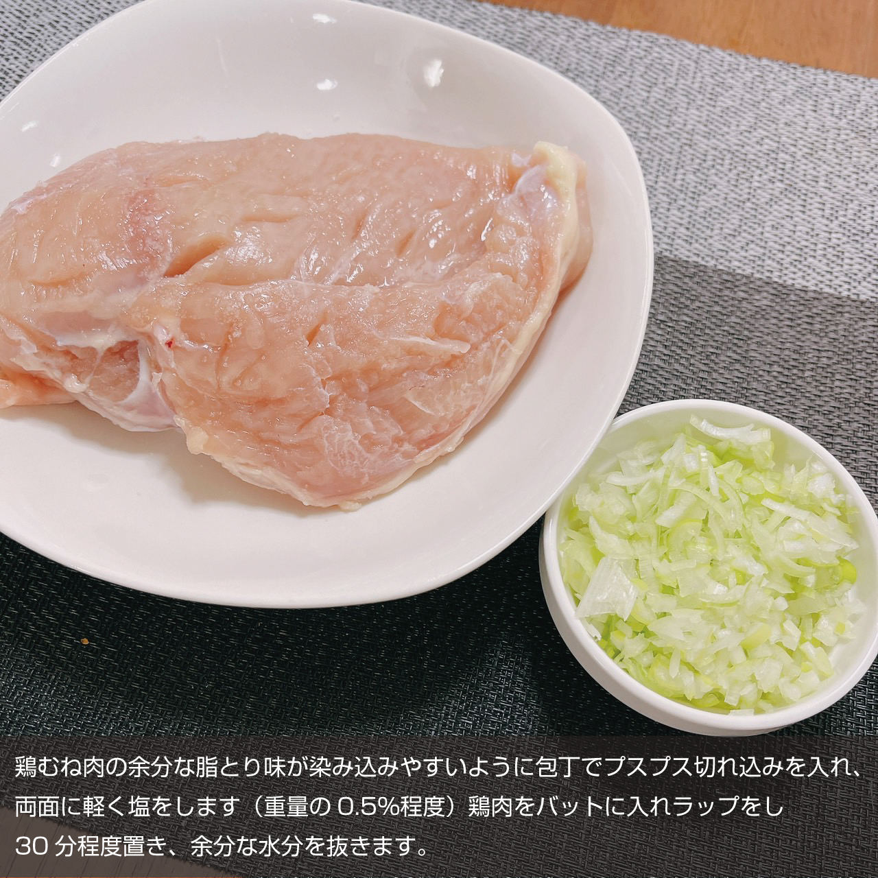 ①鶏むね肉の余分な脂とり(取らなくてもOK)、味が染み込みやすいように包丁でプスプス切れ込みを入れ、両面に軽く塩をします(重量の0.5%程度)