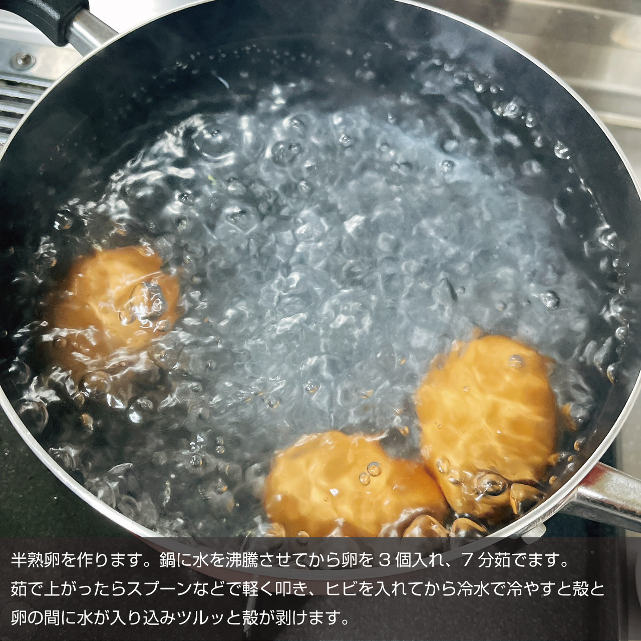 ④半熟卵を作ります。鍋に水を沸騰させてから卵を3個入れ、7分茹でます。茹で上がったらスプーンなどで軽く叩き、ヒビを入れてから冷水で冷やすと殻と卵の間に水が入り込みツルッと殻が剥けます。