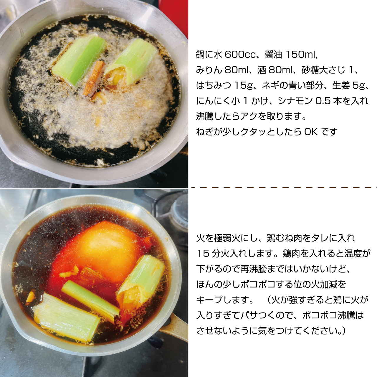 (火が強すぎると鶏に火が入りすぎてパサつくので、ボコボコ沸騰はさせないように気をつけてください。)
