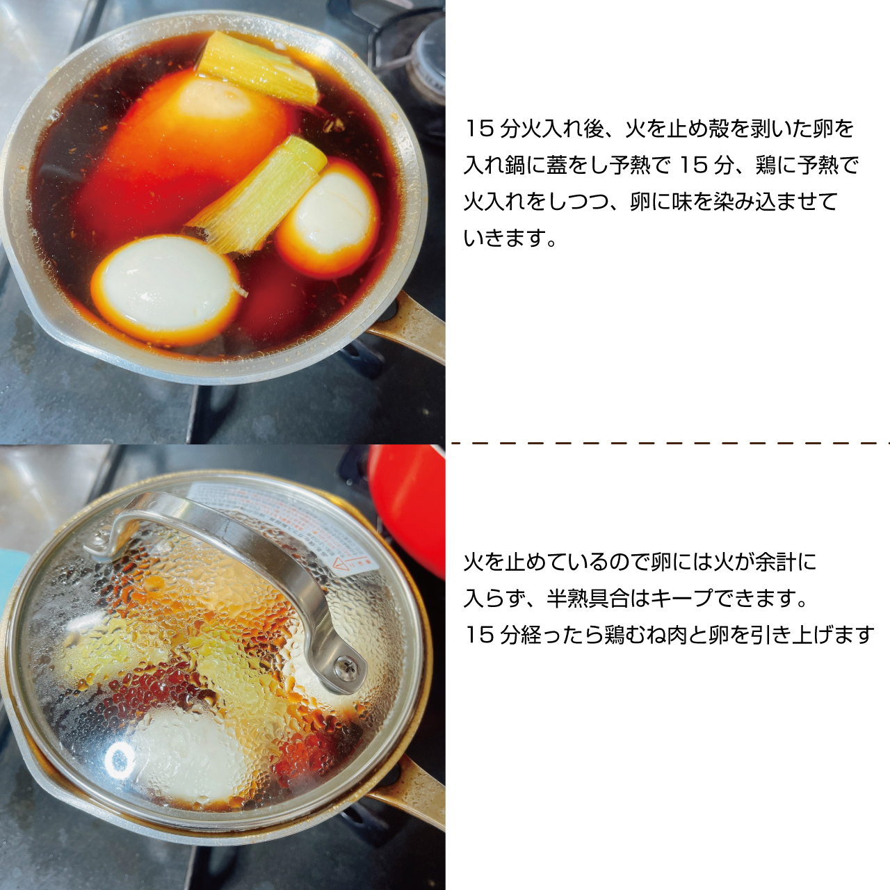 ⑦15分火入れ後、火を止め殻を剥いた卵を入れ鍋に蓋をし予熱で15分、鶏に予熱で火入れをしつつ、卵に味を染み込ませていきます。火を止めているので半熟具合はキープできます。15分経ったら鶏むね肉と卵を引き上げておきます