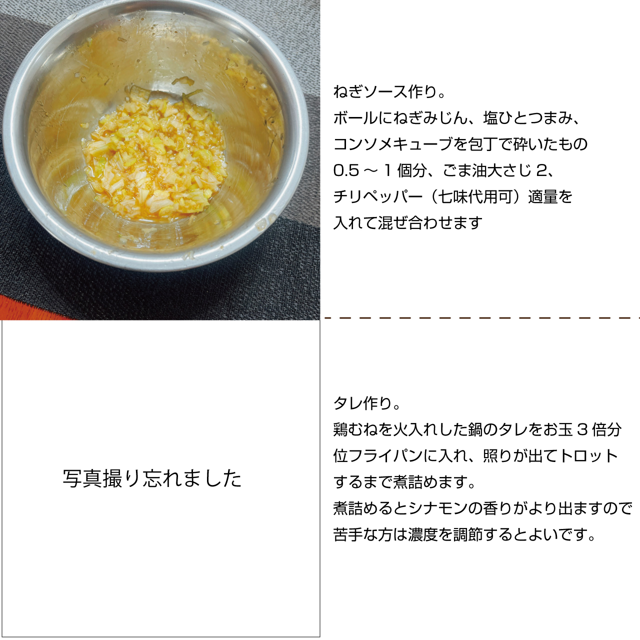 火入れを最小限にする事で、鶏むね肉なのにしっとりし、ねぎソース+シナモンソースでより鶏むね肉の弱点であるパサつきを軽減しています。