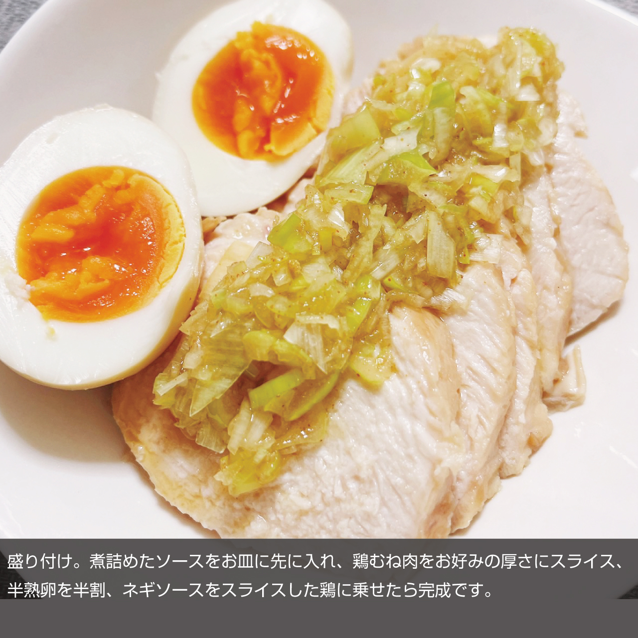 ⑩盛り付け。煮詰めたソースをお皿に先に入れ、鶏むね肉をお好みの厚さにスライス、半熟卵を半割、ネギソースをスライスした鶏に乗せたら完成です。