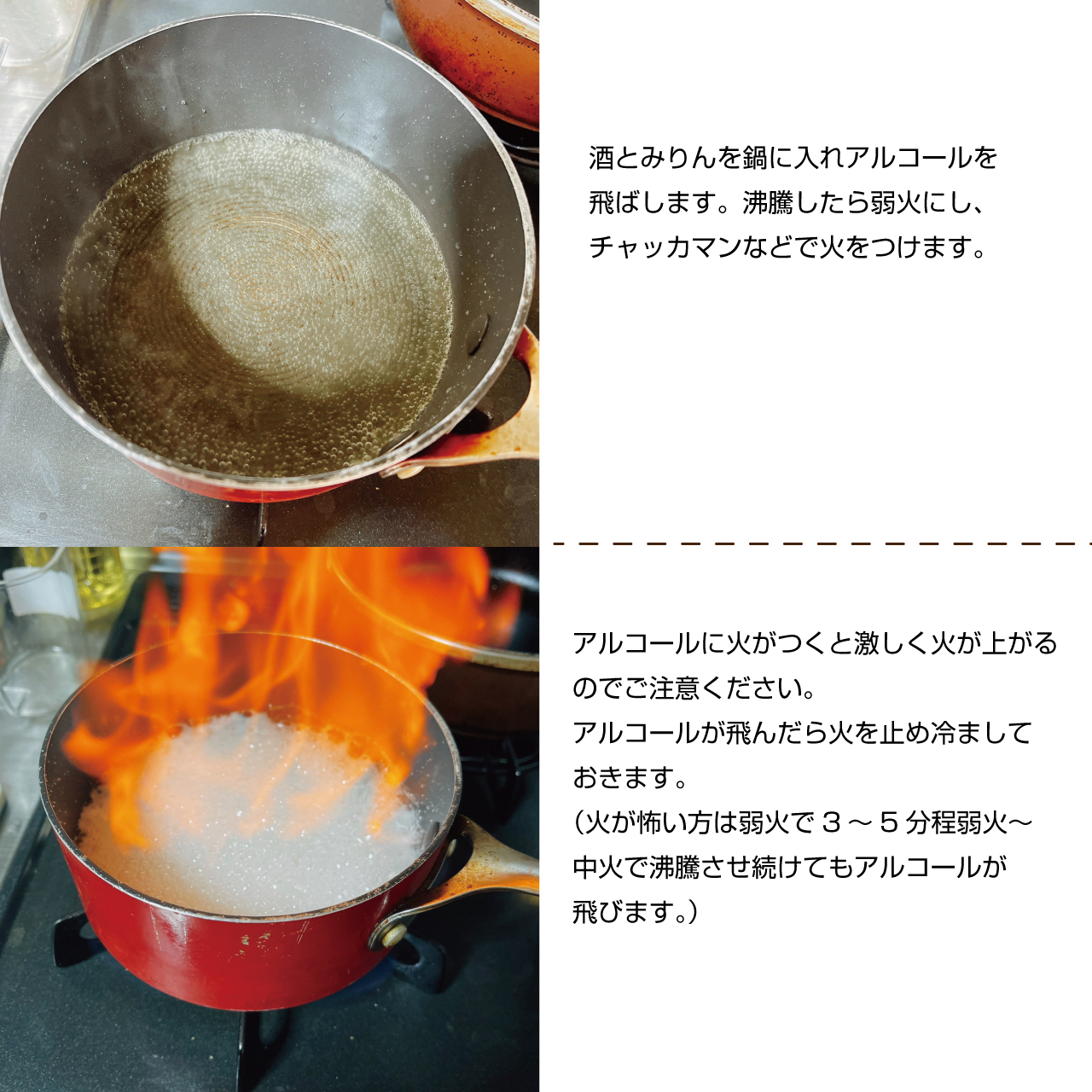 ①酒とみりんを鍋に入れアルコールを飛ばします。沸騰したら弱火にし、チャッカマンなどで火をつけます。アルコールに火がつくと激しく火が上がるのでご注意ください。
