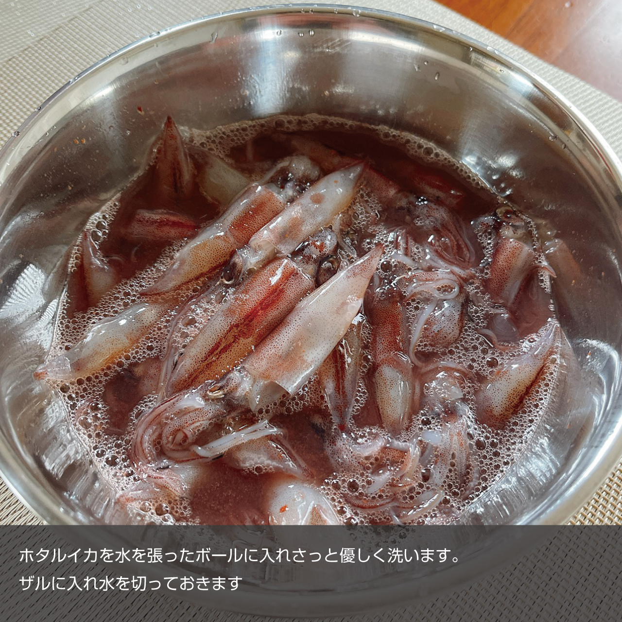 ②ホタルイカを水を張ったボールに入れさっと優しく洗います。ザルに入れ水を切っておきます