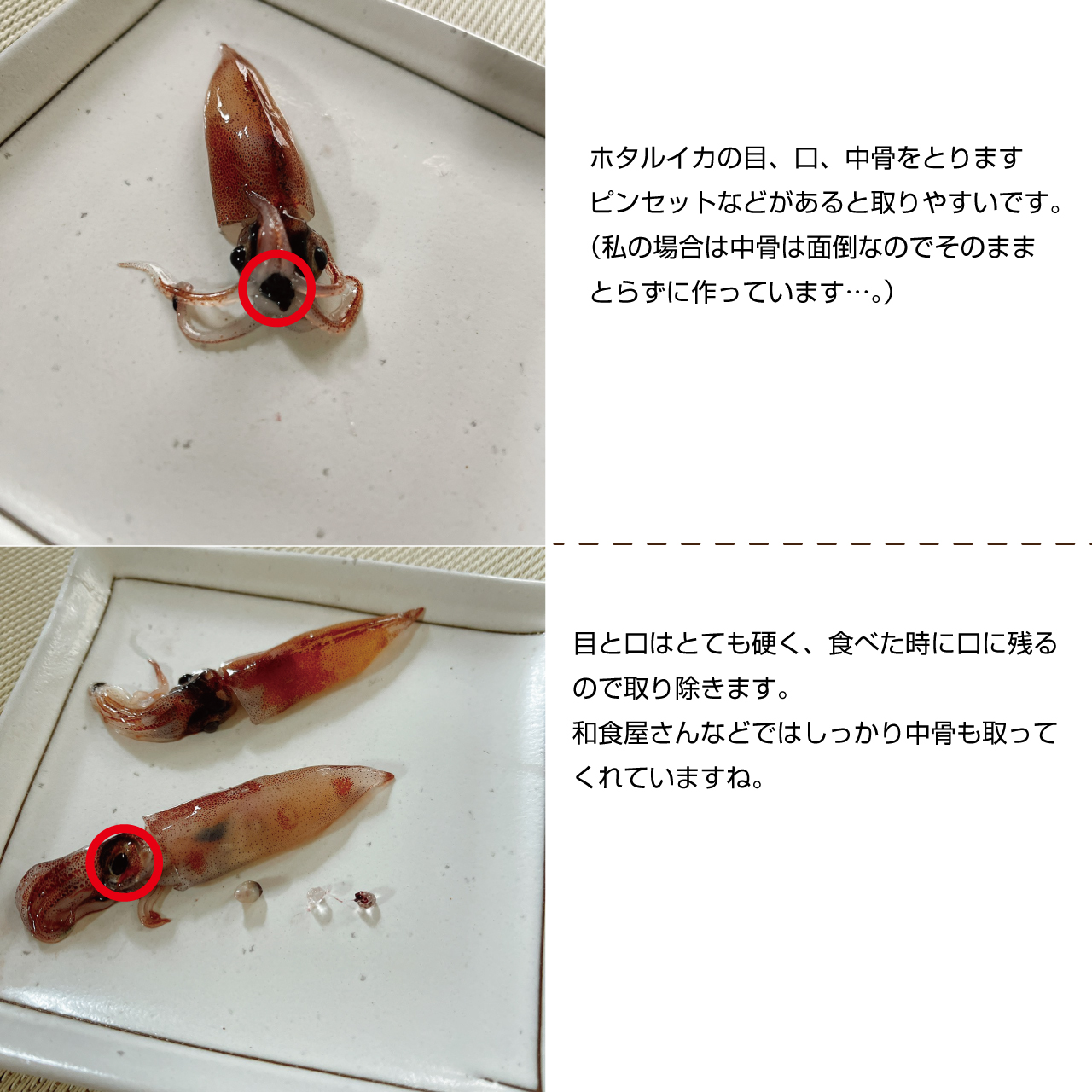 ③ホタルイカの目、口、中骨をとりますピンセットなどがあると取りやすいです。(私の場合は中骨は面倒なのでそのままとらずに作っています…。)