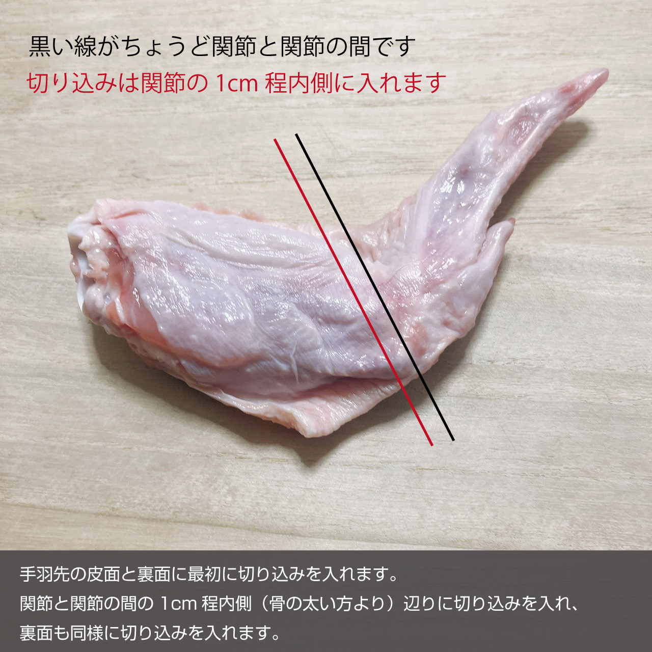 ①手羽先の皮面と裏面に最初に切り込みを入れます。関節と関節の間の1cm程内側(骨の太い方より)辺りに切り込みを入れ、裏面も同様に切り込みを