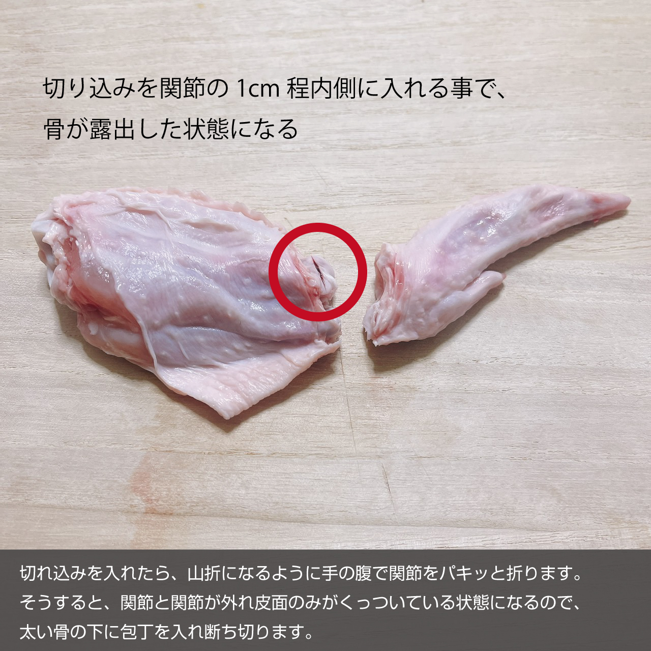 コツやポイントまでとはいきませんが、手羽先の関節の場所がわかると切り込みを入れる位置の見当がつきます。