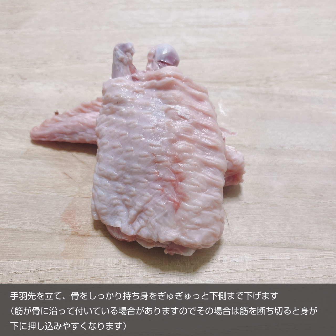 ③手羽先を立て、骨をしっかり持ち身をぎゅぎゅっと下側まで下げます(筋が骨に沿って付いている場合がありますのでその場合は筋を断ち切ると身