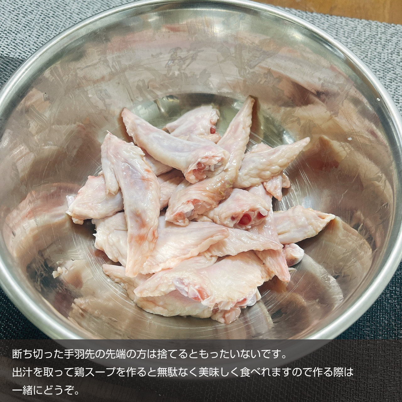 ④これで手羽先の下処理は完成です。②で断ち切った手羽先の先端の方は出汁を取って鶏スープを作ると無駄なく美味しく食べれます。