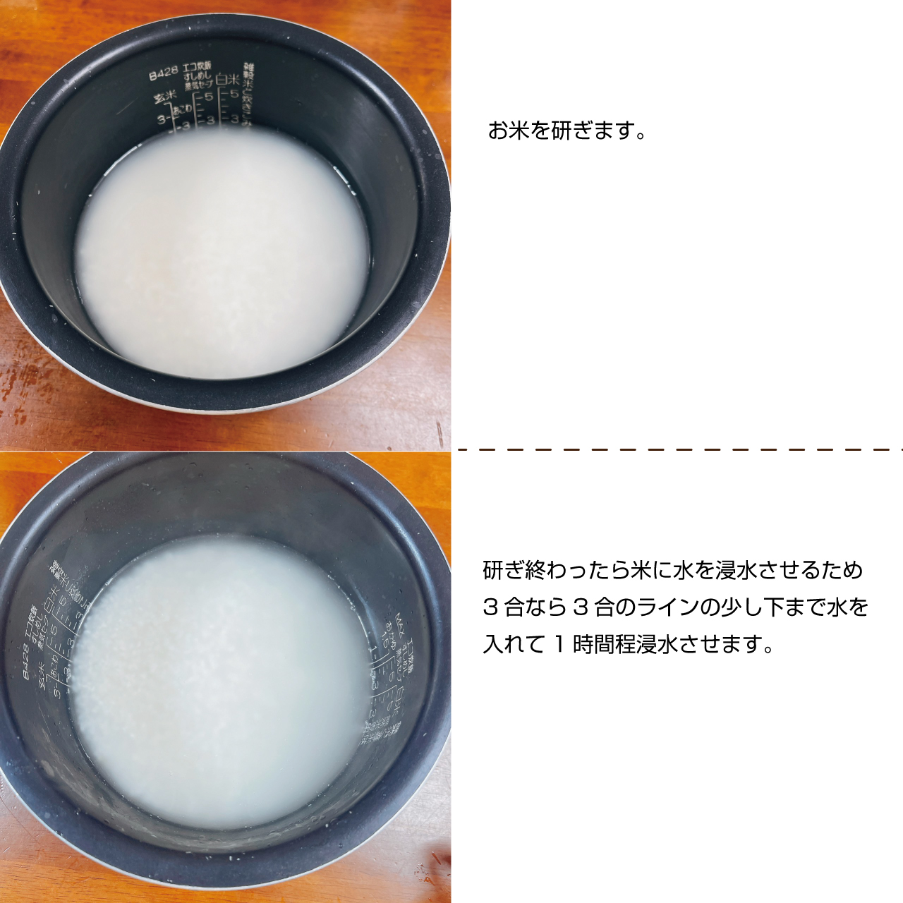 ①お米を研ぎます。研ぎ終わったら米に水を浸水させるため3合なら3合のラインの少し下まで水を入れて1時間程浸水させます。