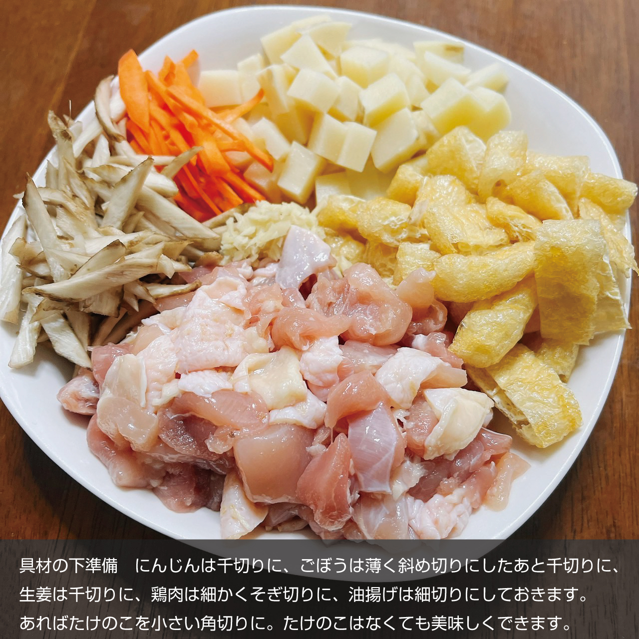 ②具材の下準備 にんじんは千切りに、ごぼうは薄く斜め切りにしたあと千切りに、生姜は千切りに、鶏肉は細かくそぎ切りに、油揚げは細切りにしておきます。あればたけのこを小さい角切りに