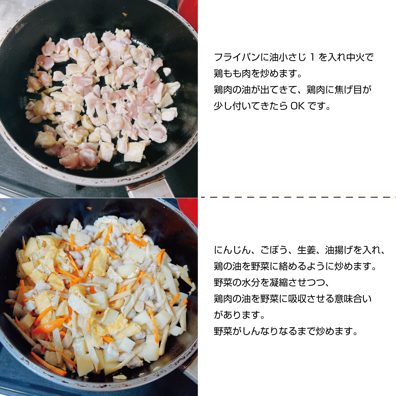 ④フライパンに油小さじ1を入れ中火で鶏もも肉を炒めます。鶏肉の油が出てきて、鶏肉に焦げ目が少し付いてきたら、にんじん、ごぼう、生姜、油揚げを入れ、鶏の油を野菜に絡めるように炒めます。野菜の水分を凝縮させつつ、鶏肉の油を野菜に吸収させる意味合いがあります。野菜がしんなりなるまで炒めます。