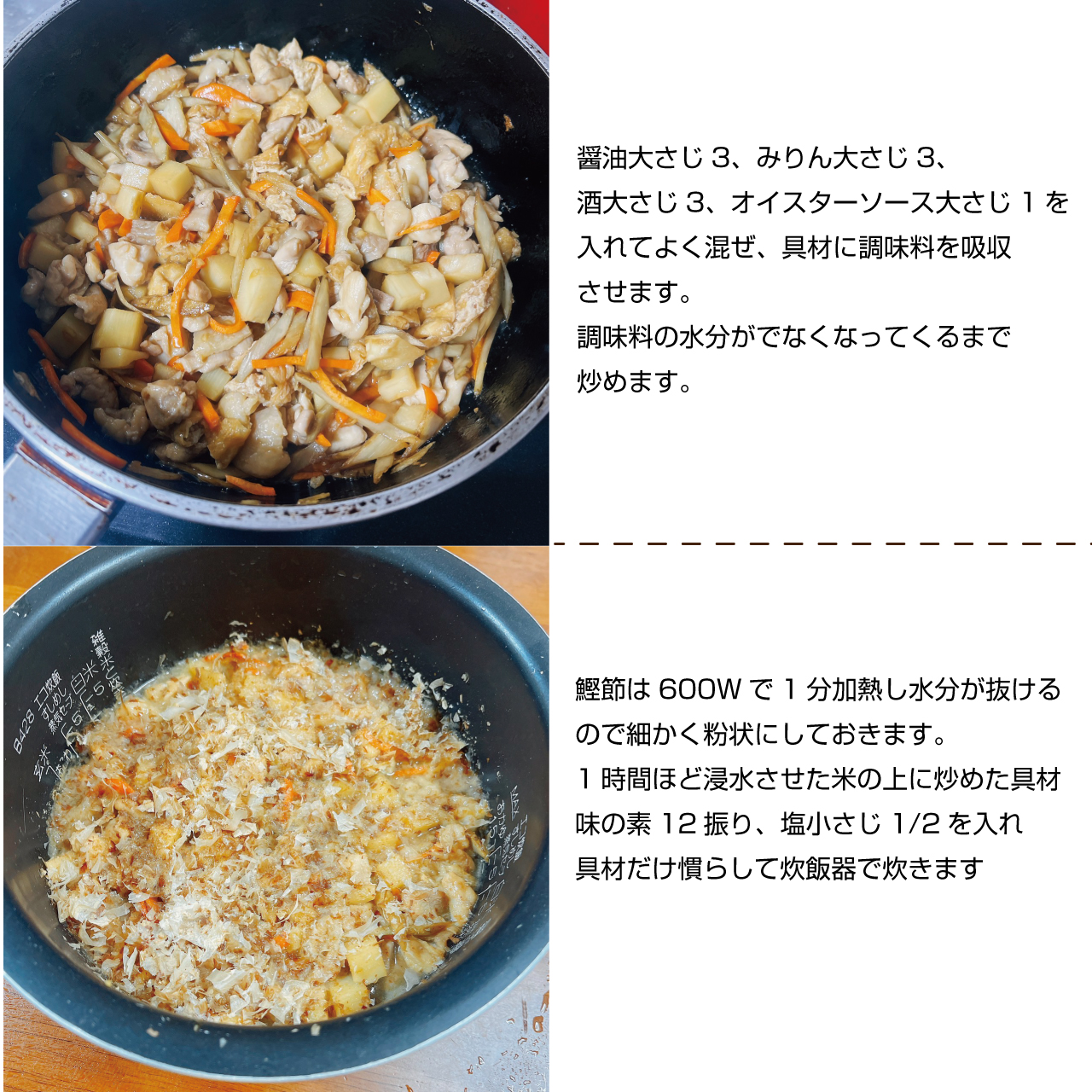 そのまま調味料で味付けするので、具材にしっかり調味料が入りおかずいらずの炊き込みご飯ができます。