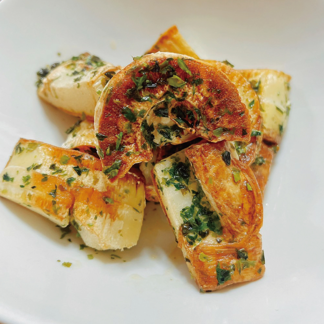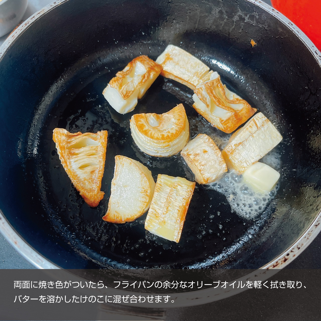 ④両面に焼き色がついたら、フライパンの余分なオリーブオイルを軽く拭き取り、バターを溶かしたけのこに混ぜ合わせます。
