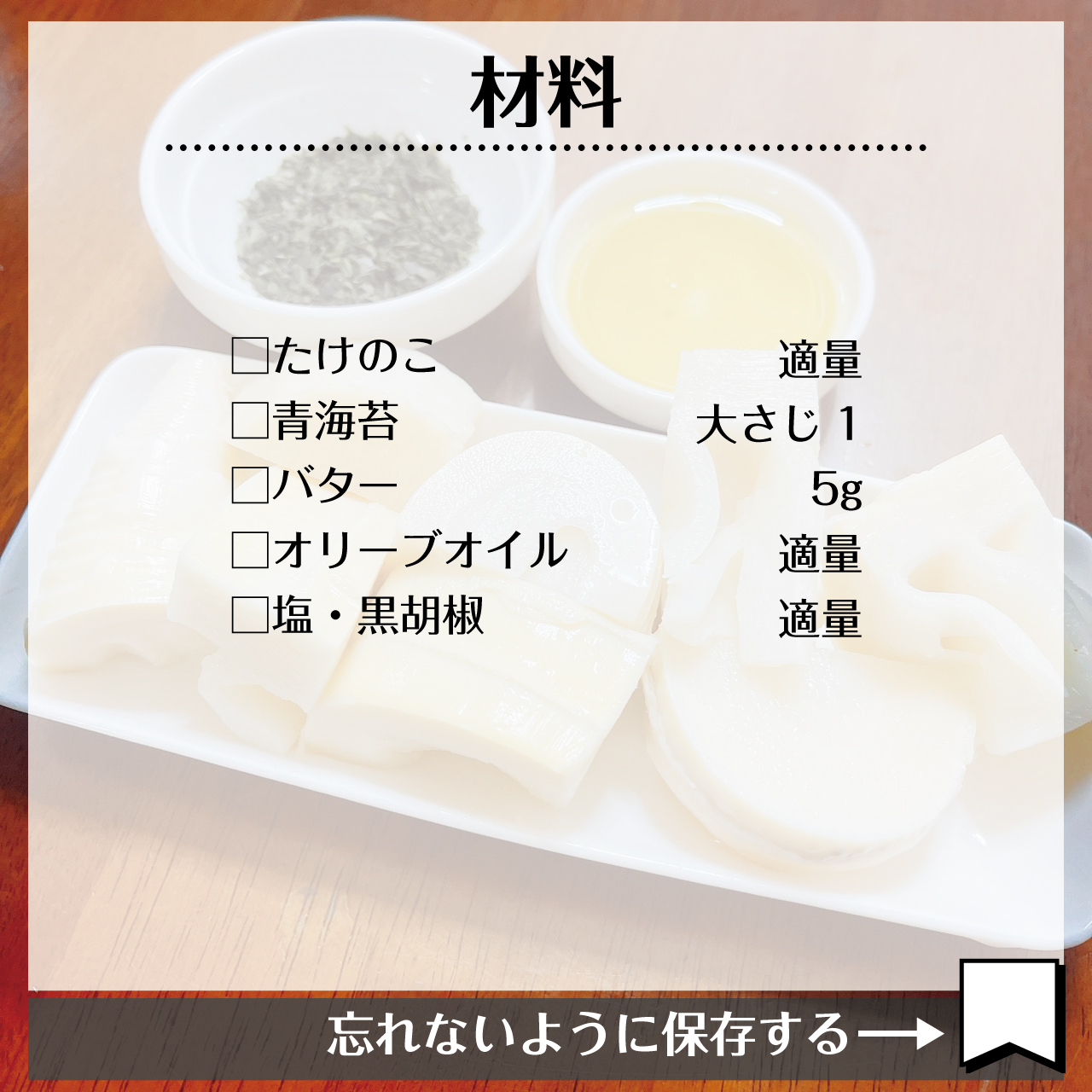 必要な食材はたけのこ、バター、塩、のり、オリーブオイル(サラダ油可)だけのシンプルな構成です。