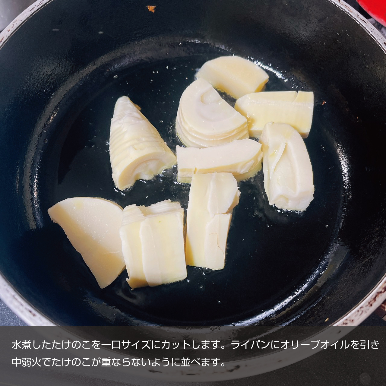 ②フライパンにオリーブオイルを引き、中弱火でたけのこが重ならないように並べ焼き色をしっかりと付けます。