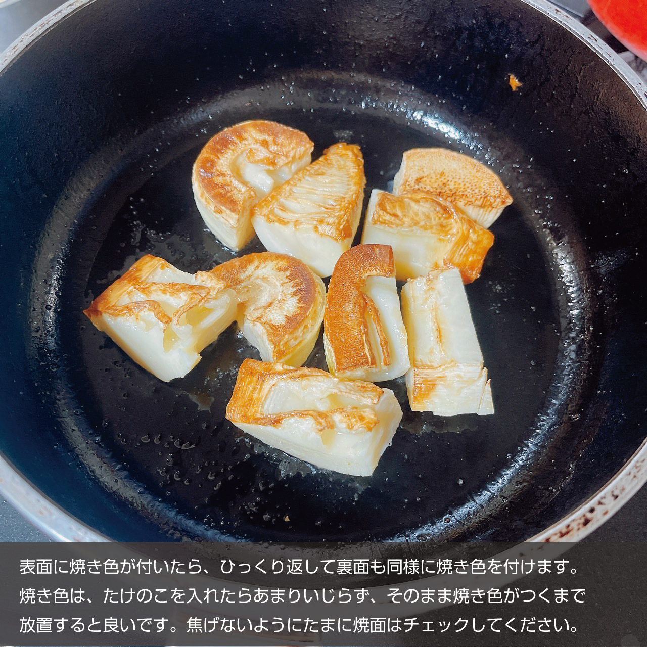 焼き色は、たけのこを入れたらあまりいじらず、そのまま焼き色がつくまで放置すると良いです。焦げないようにたまに焼面はチェックしてください。
