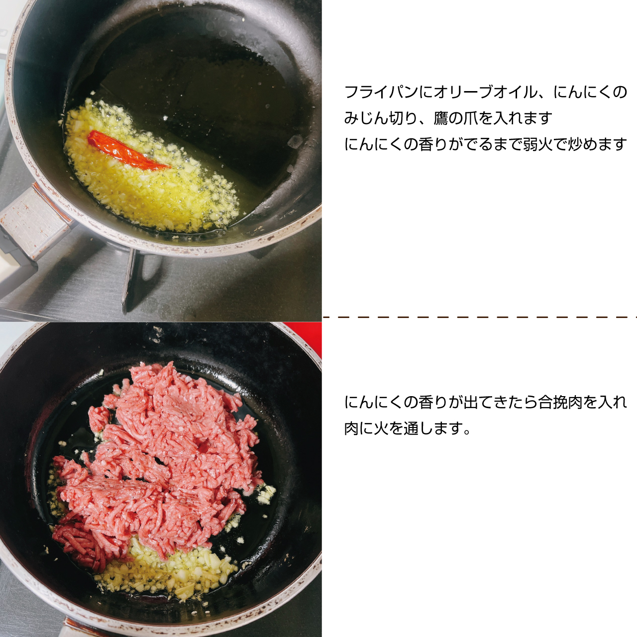 ③フライパンにオリーブオイル、にんにくのみじん切り、鷹の爪を入れます
