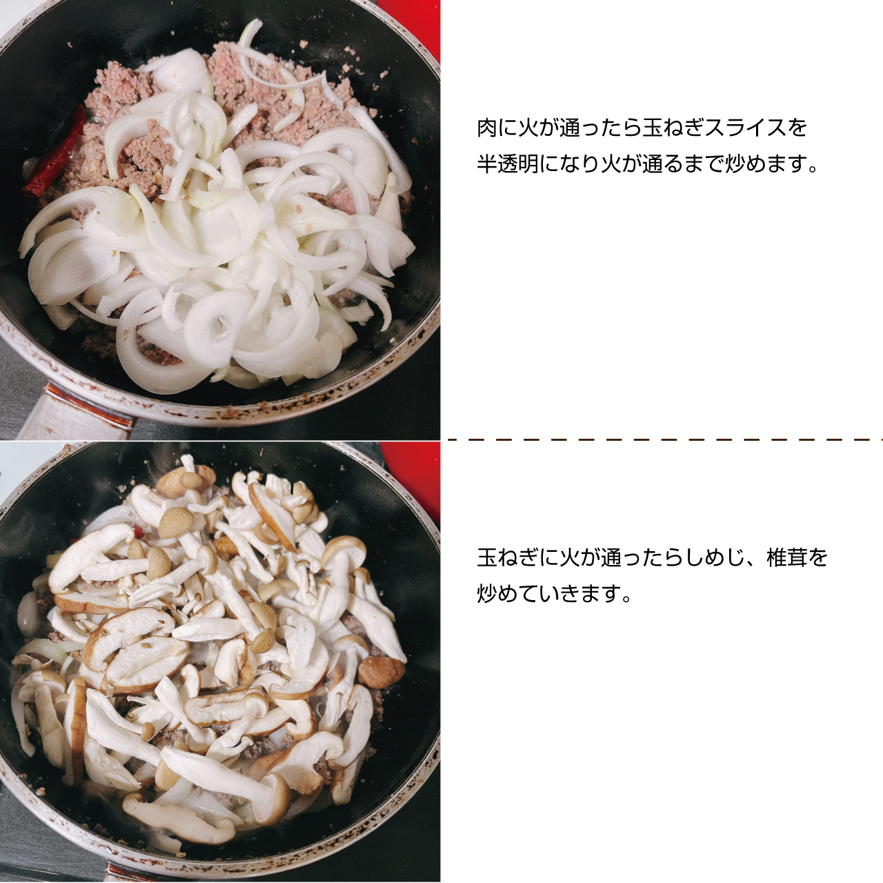 肉に火が通ったら玉ねぎスライスが透明になるまで炒め、しめじ、椎茸を入れさらに炒めます。