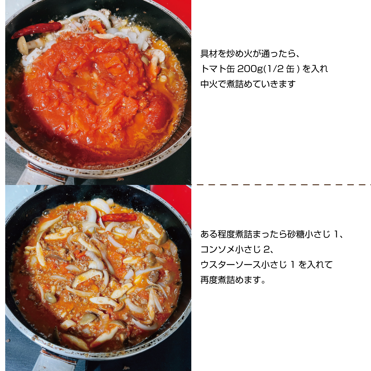 ④ ①②の具材を炒めたら、トマト缶200g(1/2缶)を入れ煮詰めていきます。ある程度煮詰まったら砂糖小さじ1、コンソメ小さじ2、ウスターソース小さじ1を入れて再度煮詰めます。