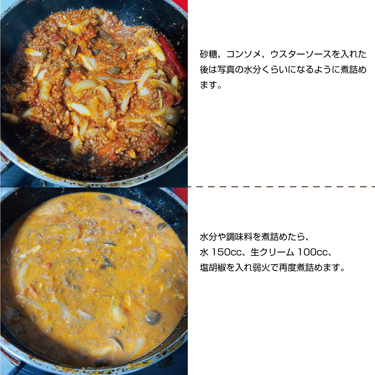 ⑤水150cc、生クリーム100cc、塩胡椒を入れ弱火で再度煮詰めていきます。