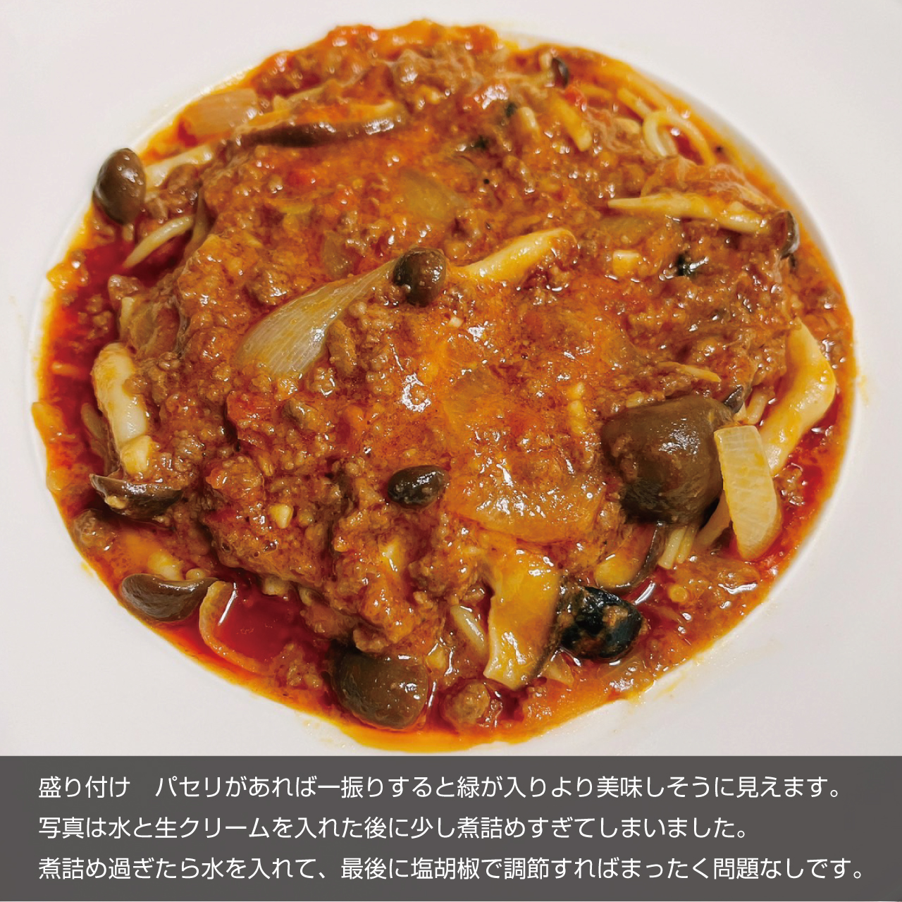 ⑧味見をし、塩コショウで調節したら完成です。ソースが煮詰まり過ぎたら水を入れ調整すれば問題ありません。