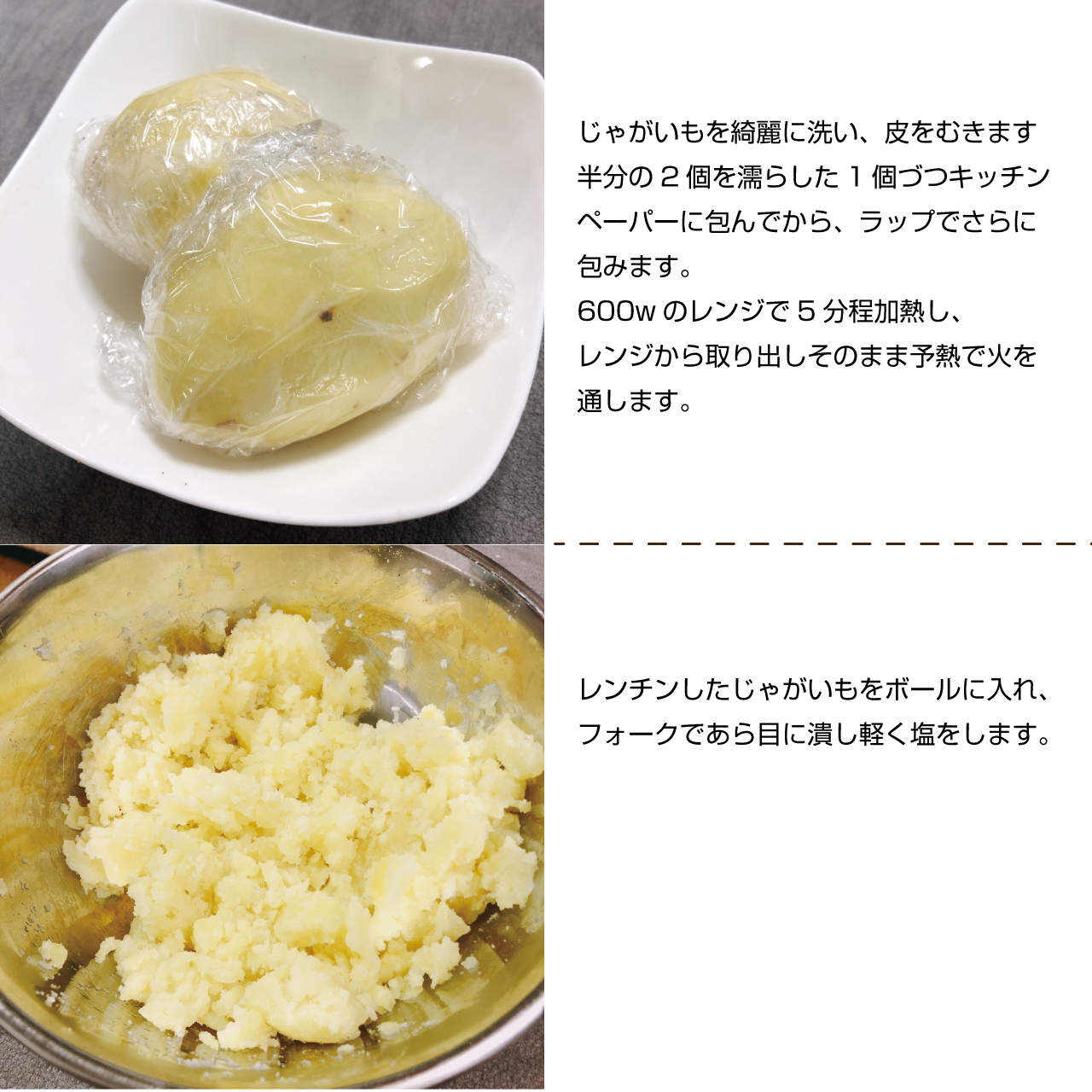 じゃがいもは半分はマッシュに、半分は生のままサイコロ上にカットして混ぜ合わせる事で、