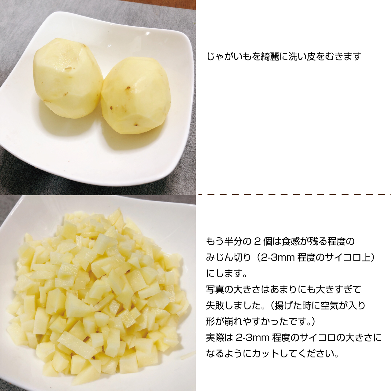 じゃがいもは半分はレンチンしてマッシュに、半分はサイコロ上にカットし合わせて揚げる