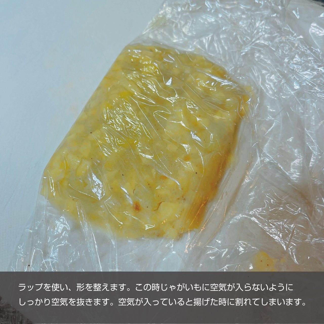 ⑥ラップを使い、形を整えます。この時じゃがいもに空気が入らないようにしっかり空気を抜きます。空気が入っていると揚げた時に割れてしまいます。