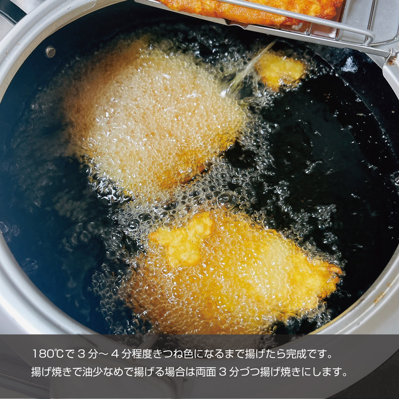 ⑦180℃で3分~4分程度きつね色になるまで揚げたら完成です。油少なめで揚げ焼きの場合は両面3分づつ揚げ焼きにします。