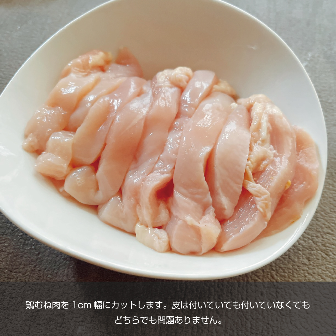 ①鶏むね肉を1cm幅にカットします。皮は付いていても付いていなくてもどちらでも問題ありません。
