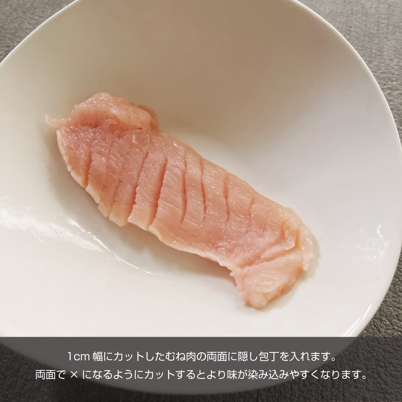 1cm幅にカットしたむね肉の両面に隠し包丁を入れます。両面で×になるようにカットするとより味が染み込みやすくなります。