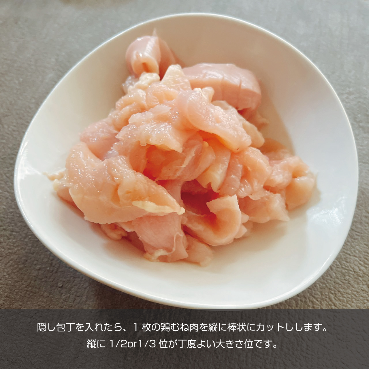 ①1cm幅にカットした鶏むね肉の両面に隠し包丁を入れる
