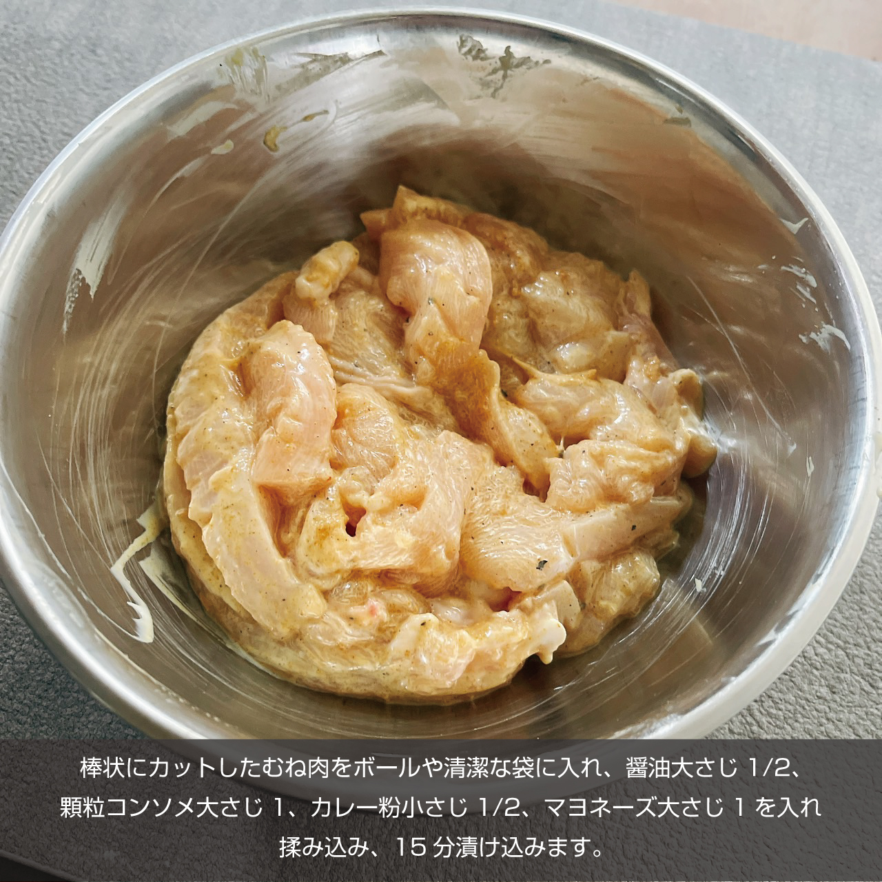 ③棒状にカットしたむね肉をボールや清潔な袋に入れ、醤油大さじ1/2、顆粒コンソメ大さじ1、カレー粉小さじ1/2、マヨネーズ大さじ1を入れ揉み込み、15分漬け込みます。
