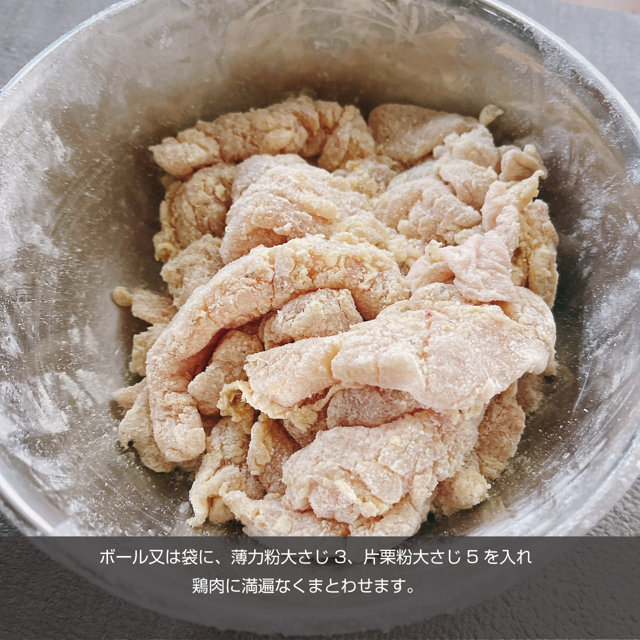 ④ボール又は袋に、薄力粉大さじ3、片栗粉大さじ5を入れ鶏肉に満遍なくまとわせます。