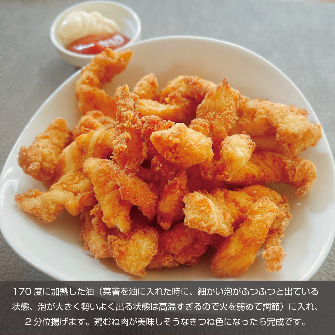 そのため鶏肉にマヨネーズを加えると、しっとり柔らか食感に仕上がるという訳です。むね肉にマヨネーズはまさにピッタリな組み合わせです。