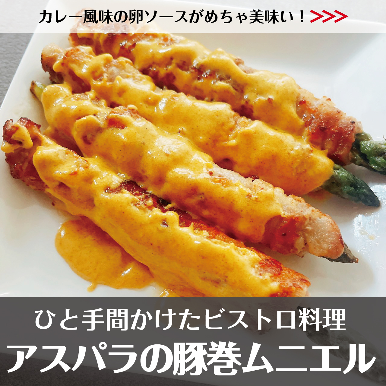 ソースサバイヨンオキュリーというカレー風味の卵ソースと合わせて食べるアスパラの豚肉巻きです。