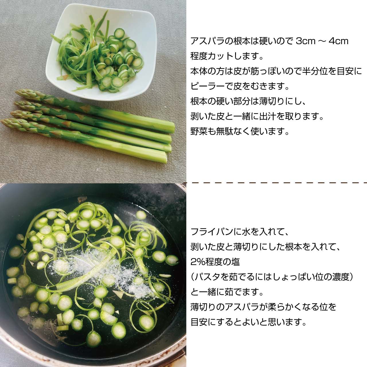 アスパラを茹でる水ですが、根本の硬い部分の薄切りと剥いた皮の端材を使って出汁を取ります。この中でアスパラを茹でる事で、